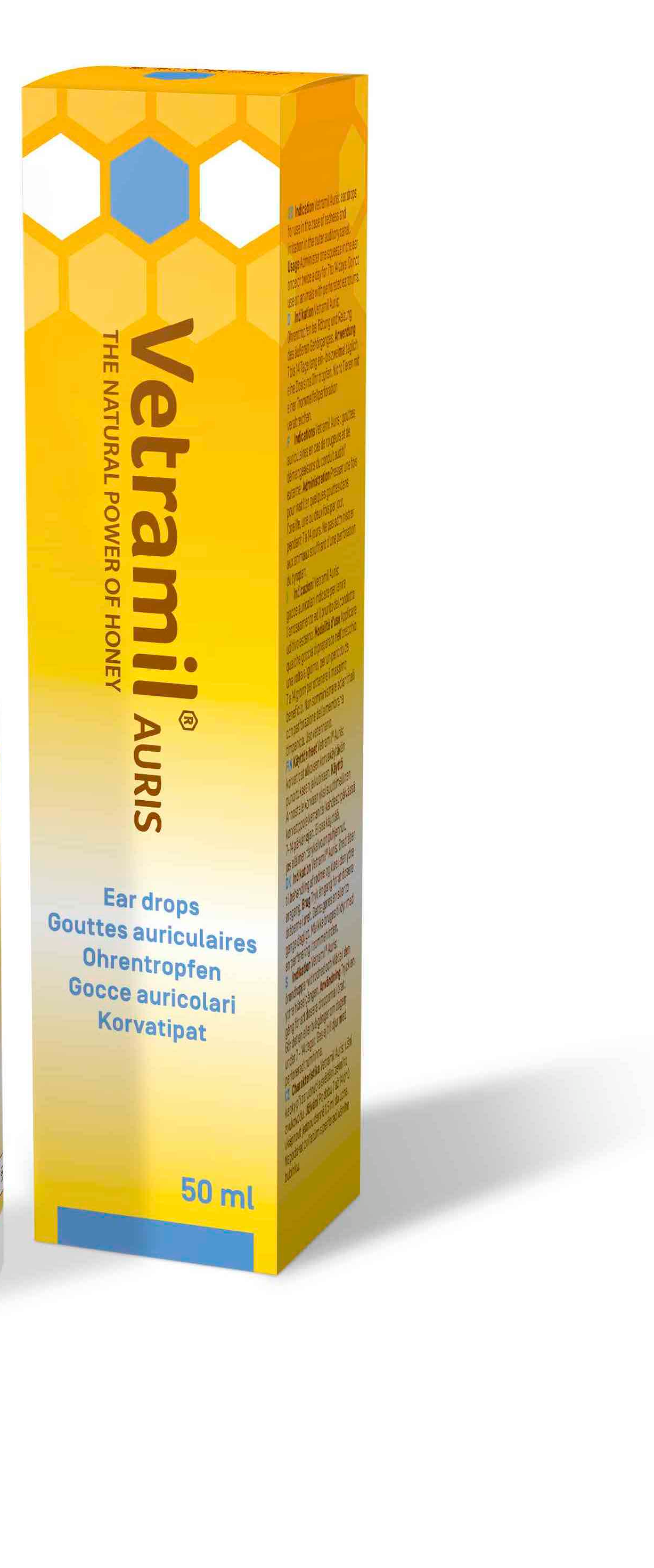 Το Vetramil Auris είναι μια μοναδική φόρμουλα με μέλι που βοηθάει στην αποκατάσταση του (εξωτερικού) ακουστικού πόρου. Τα αντιοξειδωτικά στο μέλι καταπραΰνουν το ευαίσθητο και κόκκινο δέρμα του αυτιού. Στην καθημερινή φροντίδα του αυτιού πρέπει απαραιτήτως να περιλαμβάνεται η καθαριότητά του. Το Vetramil Auris περιέχει προπυλενογλυκόλη, η οποία βοηθά στον καθαρισμό του ακουστικού πόρου διαλύοντας το κερί που έχει συσσωρευτεί σε αυτόν.