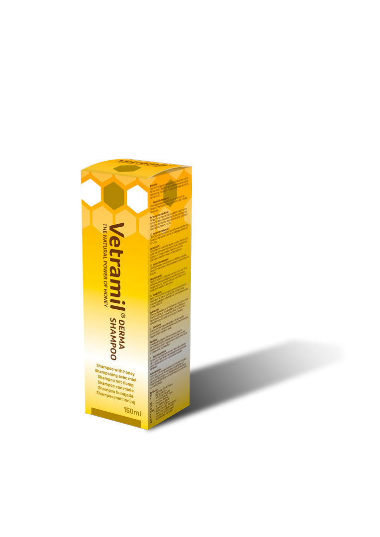 Το Vetramil Derma Shampoo είναι ένα επαγγελματικό σαμπουάν ειδικά σχεδιασμένο για σκύλους με ευαίσθητο δέρμα. Το pH του σαμπουάν είναι προσαρμοσμένο στην υψηλότερη οξύτητα του δέρματος του σκύλου, έτσι ώστε να μην επηρεάζονται τα φυσικά έλαια στο τρίχωμά του. Το σαμπουάν περιέχει έναν τύπο μελιού πλούσιο σε ένζυμα. Τα φυσικά, φυτικής προέλευσης αντιοξειδωτικά και ένζυμα στο μέλι έχουν καθαριστική και καταπραϋντική δράση, ειδικά για το ευαίσθητο δέρμα του σκύλου. Η προσθήκη εκχυλίσματος αλόης βέρα εξασφαλίζει την ενυδάτωση και καταπράυνση του δέρματος. Το καστορέλαιο κάνει καλό στο τρίχωμα και προσδίδει ωραία λάμψη.