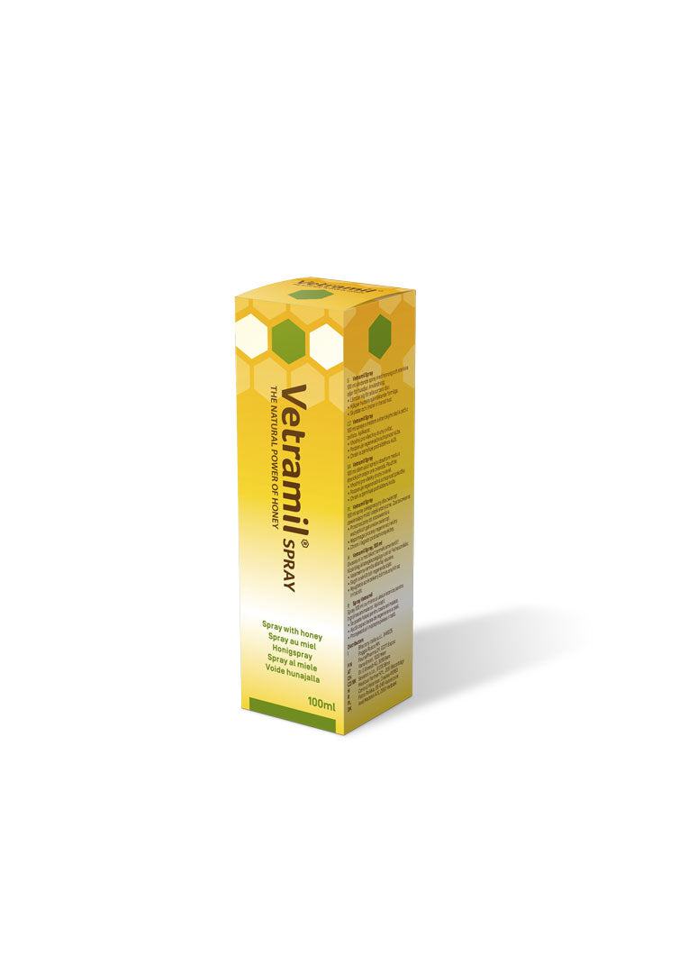Το Vetramil® Spray είναι ειδικά σχεδιασμένο ώστε να καταπραΰνει και προστατεύει το ερεθισμένο δέρμα και να υποστηρίζει τους φυσικούς μηχανισμούς αυτοΐασης του οργανισμού. Συνδυάζει τα ευεργετικά συστατικά του μελιού με επιλεγμένα αιθέρια έλαια σε μορφή εξαιρετικά λεπτής υφής γαλακτώματος, που επιτρέπει την εύκολη εφαρμογή, καθιστώντας το ιδανικό για σημεία δύσκολης πρόσβασης όπως τα πόδια ή η κοιλιακή χώρα. Περιέχει μέλι ειδικής επεξεργασίας, υψηλής ποιότητας, πλούσιο σε ένζυμα και με χαμηλό pH, που βοηθά στη διατήρηση της φυσικής οξύτητας του δέρματος, προάγοντας τη φυσική αναπλαστική του ικανότητα. Τα επιλεγμένα αιθέρια έλαια έχουν αντιμικροβιακές ιδιότητες και συμβάλλουν στη διατήρηση της καλής υγείας του δέρματος.